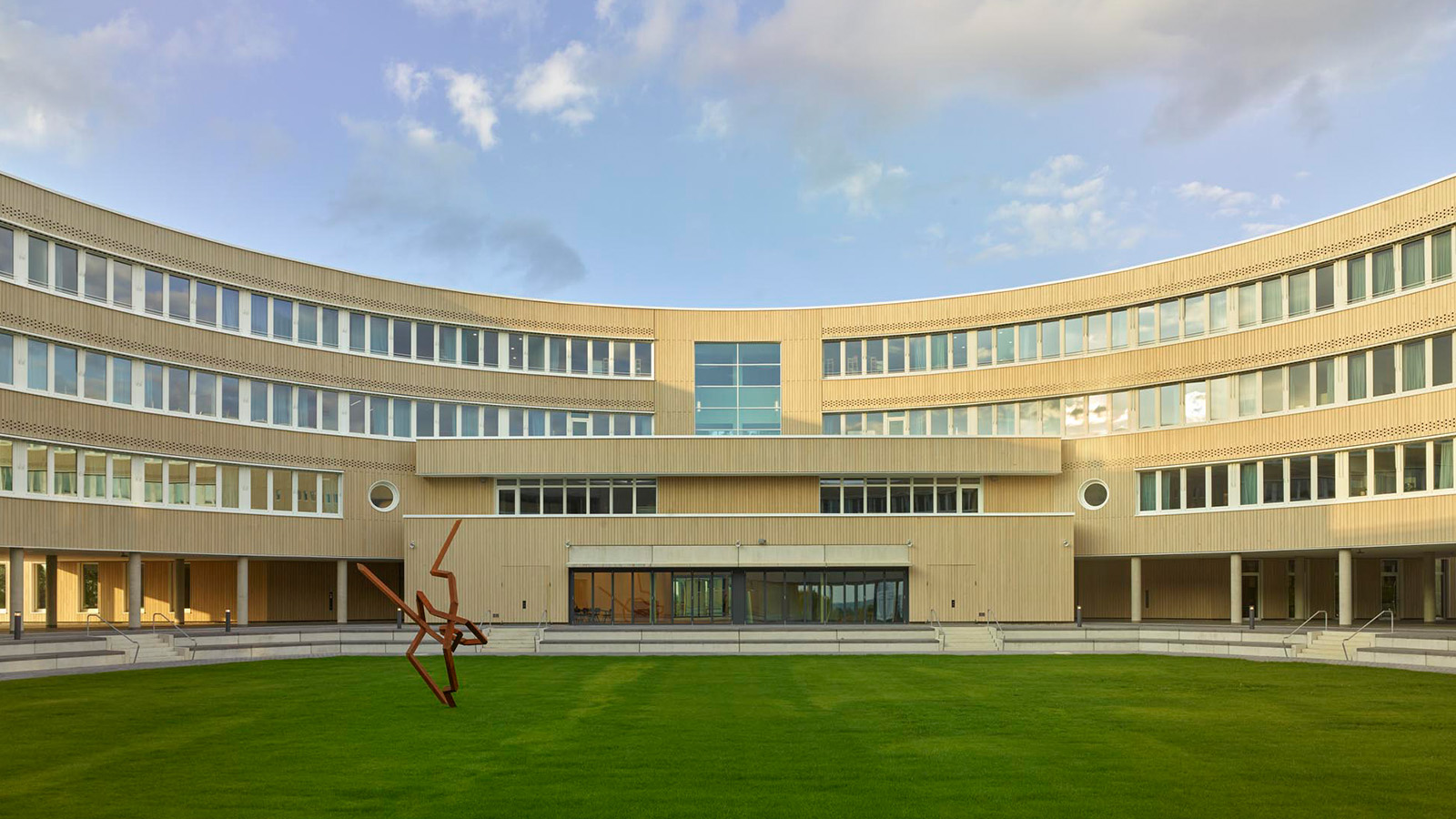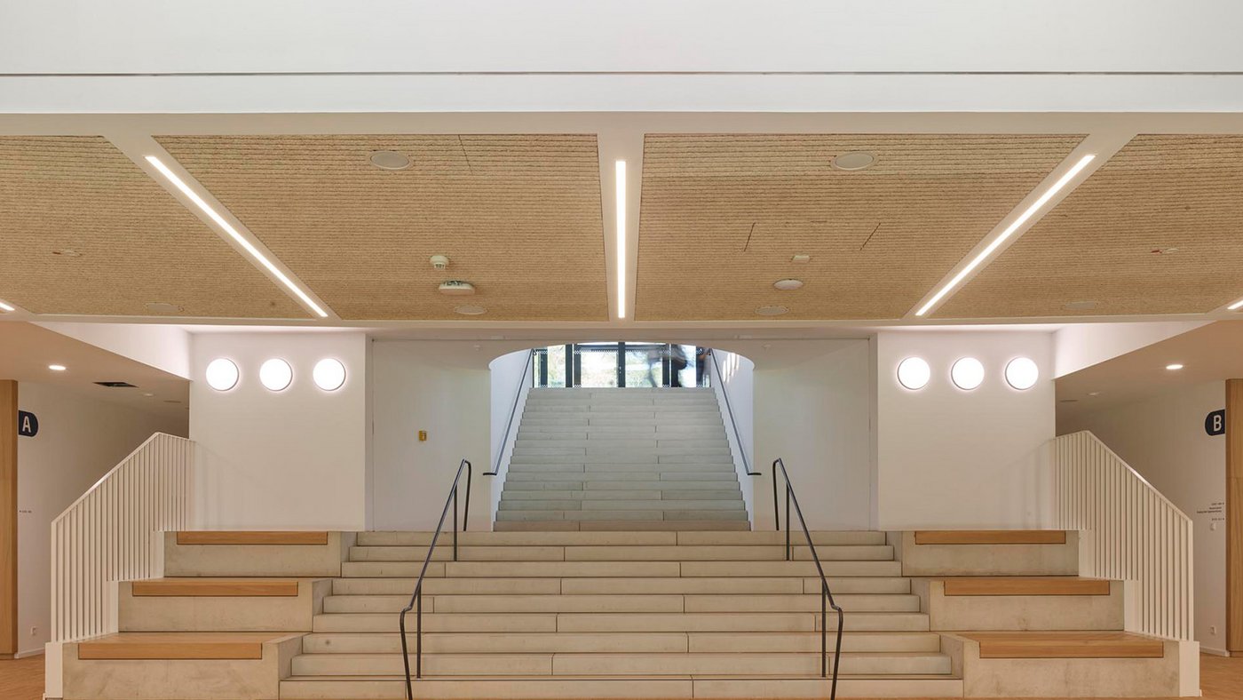 Der markante Rundbau, Holzfassaden, effizient strukturierte Grundrisse sowie ein ganzheitliches Barrierefreiheitskonzept prägen das Gebäude. Ergänzt wird das architektonische Konzept durch eine wirtschaftliche Bauweise mit Betonfertigteilen, eine kompakte Gebäudestruktur, extensive Dachbegrünung und großflächige Photovoltaikanlagen. So entstand ein zukunftsfähiger, langlebiger und wirtschaftlicher Schulbau.
